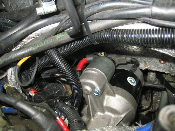 So the first job is to repair the solenoid wire with some silicone and a couple of turns of insulating tape. Then I reinstall the starter, first wriggling it in upside-down, and replacing the main leads, making sure that the insulating covers are properly in place. Then I turn it and manouevre it into position, and replace the two cap bolts, before reconnecting that solenoid wire.