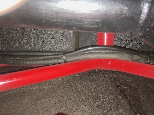 What I do notice while I’m under there, is a tiny trail of brake fluid from the connector on one of the rear flexi brake pipes. I get a couple of spanners and tighten up the connector.