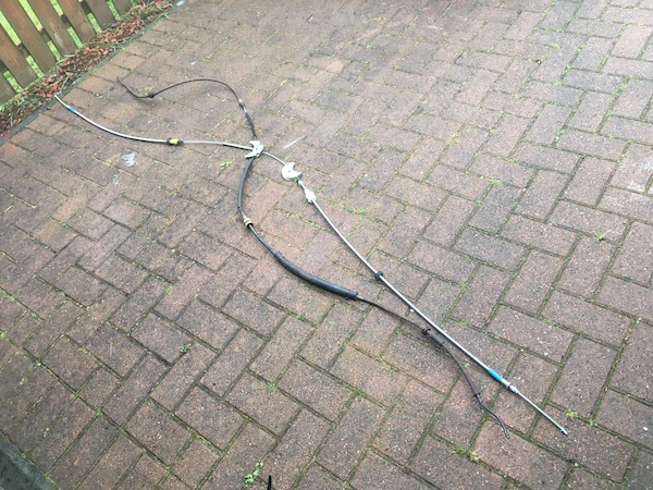 Then I undo the nuts holding the handbrake cable on to the trailing arms, then back under the car to remove the split pin and clevis pin from the cable connection to the handbrake lever. That lets me disconnect the cable from its two chassis mounting points - one is the adjuster above the diff, the other is a fixed mounting in the offside wheel arch.