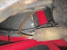 Moving forward, and looking upwards past the prop shaft, you can see 3 hoses here, fixed to the top rail of the chassis. The thin shiny one is plastic, not rubber, and is the main feed from the filter to the fuel rail on the engine. The hose nearest to us (with the yellow print on it) is the fuel return hose from the pressure regulator back to the tank. The other hose is part of the fuel tank ventilation system - it brings fuel forward to a solenoid where it gets sucked into the inlet manifold and burnt off.