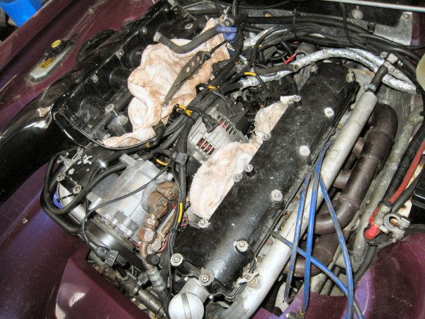 Then I remove the two bolts and spacers golding the throttle cable bracket on to the nearside rocker cover, and move it out of the way, and the engine is then stripped to here. I've stuffed rags into the inlet tracts on one side, and into the fuel injector ports on the other side. I can see the starteer motor from here!