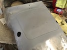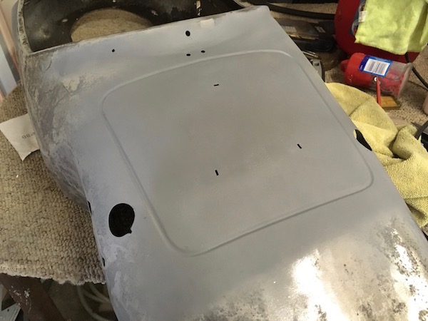 I give the bonnet and the rear a light spray of grey primer - it’s very hard to see dings and imperfections on bare metal, when light is reflecting all over the place - a nice flat grey finish makes them much clearer. I leave that to dry before I do any more panel beating.