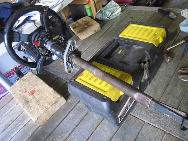 I decide to take the plastic cowl off the steering column so I can have a look. That’s all, I’m not wearing my “working on the car” clothes. 10 minutes later the column is out and on the workbench.