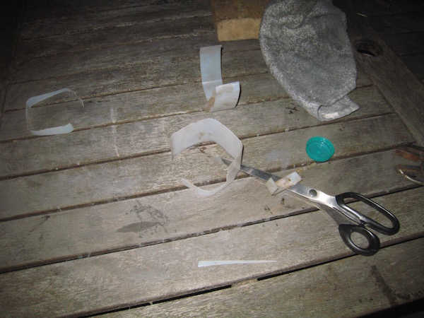 It’s obvious really - I need to pack it out with more plastic. This old milk bottle will do. I cut out a bit that goes round three sides of the inner triangular bit, but that’s too thick. So I cut it down to two sides, and that’s almost ok, but still too thick.