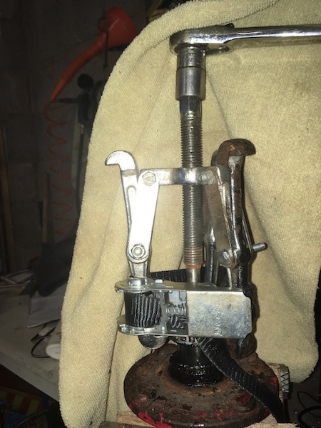 Then I use a puller to get the outer bearing off the shaft. The puller keeps slipping off the bearing, though, so I wrap it in 4 turns of webbing and tighten the clamp to hold the puller legs in. That works a treat!