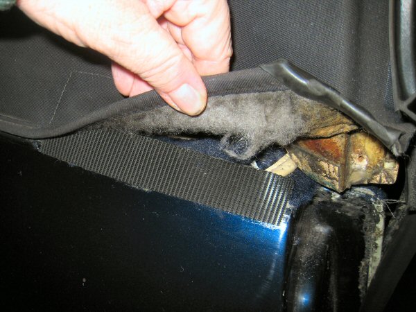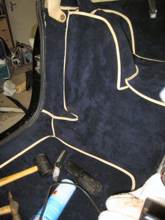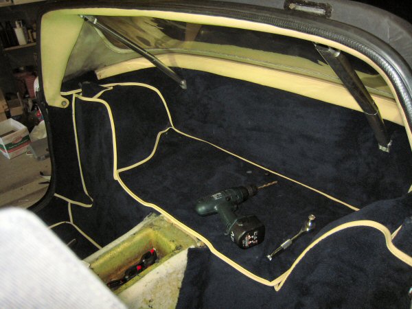 Then I mark through the holes for the roof struts, and drill through the carpet from the boot, then reinstall the struts. The door rubbers aren't finished in this photo - I need to finish trimming the carpet around the tops of the door pillars first.