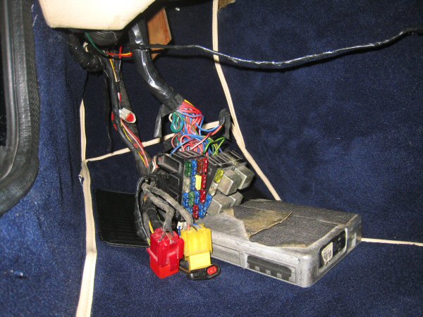 Then I tidy up the wiring in the passenger footwell, and lift it all up into place and push the footwell cover into place. Because it's been in the shade and not exposed to the sun (or to the dampness in the footwell) it has hardly faded at all, so I think I'll leave it with the original map pocket in place.