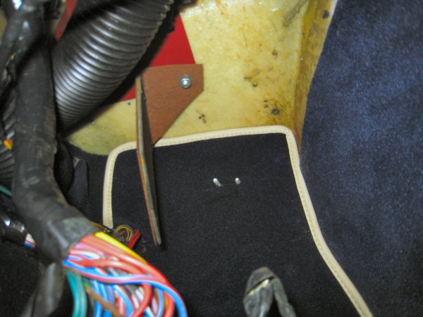 While I've got the drill out, I use a sharp thingy (I don't know what it is, it's sharp and it's got a handle - oh yes, a bradawl, that's it!) pushed up through the floor, to show me where I have to make holes in the carpet - 4 each side for the seat bolts, and 2 each side for a pair of push fasteners that seem to hold the front edge of the rear section down. Then I drill through the carpet, making sure I don't enlarge the holes in the body tub. The two front ones (for the clips) are right above the outrigger crossmembers, so I also have to be carful not to drill holes in the top of those!