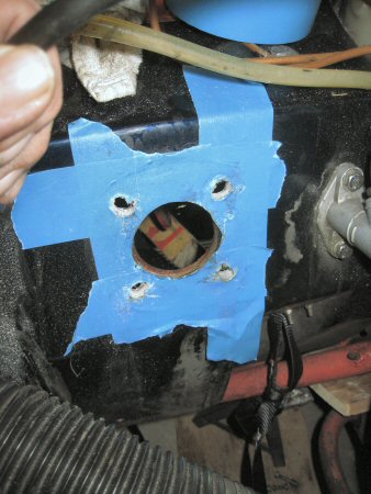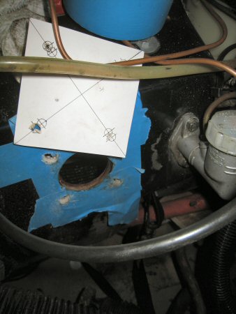 First I stick masking tape over the existing holes in the bulkhead, to give me something to mark on. Then I take the template I made, and mark through the edges of the enlarged holes - two to be elongated outwards, the other two inwards.