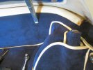 The next bit to go on is the inner sill, which is one piece with the outside of the footwell. I line it all up so that the bound rear edge is in the right place, and notice that the front edge of the door opening is miles out. Then I realise that it's cut to fit an S1 / S2 - and mine has longer doors so I'll need to trim them. I run a permanent marker around the edge of the door, on the rear of the carpet, and also mark where the heater hoses go through the bulkhead, and then remove the carpet and trim it to shape. Another refit to check, and then remove, spray with adhesive, and refit. It's a bit of a faff to pull the carpet forward past the pedals, but I eventually get it all nice and smooth, pushing it into the edges and the mouldings in the floor under the seat. A final trim with a knife, and it looks good!