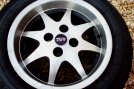 Following the success of cleaning and polishing one wheel, I decide to do the other three. This is the state of the first wheel I take off. The photo doesn't really do justice to the dull finish, and the amount of chipping and scratching.