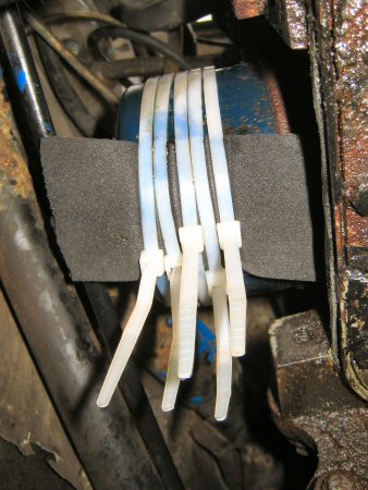 Dave uses a bit of self-adhesive neoprene foam, and sticks it over the hole, then fixes it in place with a handful of cable ties. Jim starts it up and hooray - no leaky no more!