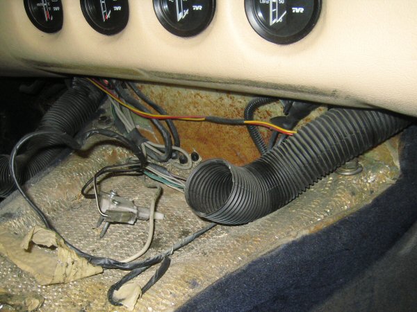 That only leaves the sides of the footwells. The dribers side is easy = the carpet just rips out once I get hold of an edge. There is a single screw up behind the dash, which seems to be an instrument earth, but I can't get to it. I rip the carpet around it.