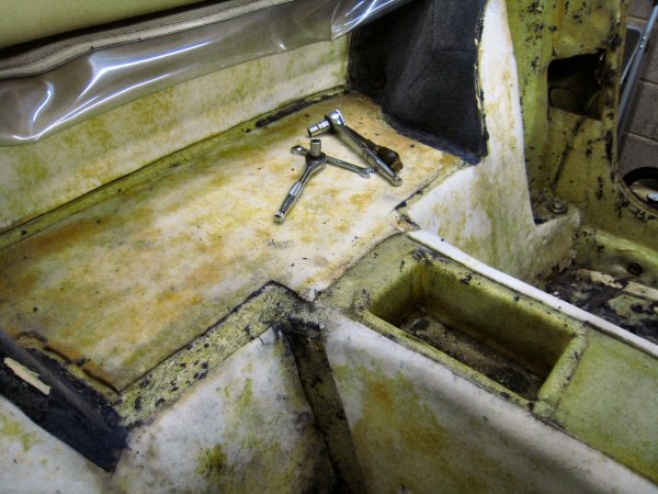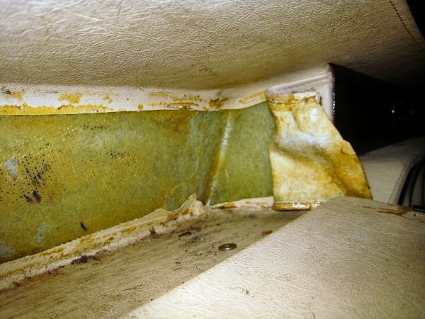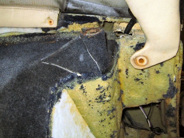 Then it's on to the vertical panels behind the seats. I lever the edge away, in front of the top seat belt mount, and the carpets come off more or less in one piece, except for the bottom 4 inches or so which have been soaked and are falling to bits. These can't be scraped off, because there is a foam backing, so the old carpet has to be picked off in tiny bits.
