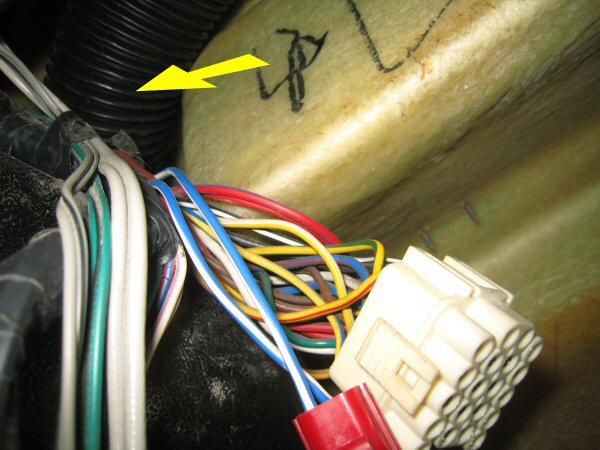 Now we can almost see what we're doing. The nut I am trying to reach is behind that heater duct, where the yellow arrow points. You can see the glove box above the white connector, and the two self-tappers holding the glove box hinge.