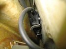 The nut is still not easy to reach - I can just get a finger tip on it, but I can't see it. I wedge myself upside down in the footwell so that I can get my arm up round the various obstructions, with a stubby 10 mm spanner. I can only get about 1/12th of a turn at a time, so the process is - fiddle about blindly till the spanner goes on the nut, turn it 1/12 of a turn, remove the spanner and turn it over, fiddle about blindly till the spanner goes on the nut, turn it 1/12 of a turn, remove the spanner and turn it over... you get the idea - and all the time using a spare finger to hold back the excess leathercloth so that the spanner doesn't scrunch it up against the nut.