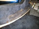 Next, the two vertical bits just behind the doors (where the roof hoop bolts through). I remove the rubber door seals, then I rip the caerpet off, and undo the roof bolts which are not into captive nuts - you need to get a hand up inside the rear panel behind the door, to hold a 13mm spanner on the nut inside. Note to self - remember this before you stick these new bits down!