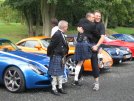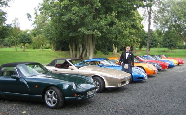 Today I am breaking a rule - this site is supposed to be about the car, but today the car took second place when we went to Robert and Vicki's wedding. 11 of us met up first, and after a bit of "will it rain / oh it's already raining / roof on / roof off" hilarity, we set off for Robert's house where he was, I think, mildly surprised to see us all pitch up in the street outside to take him to the ceremony. He chose Brian's 350 (who wouldn't?) as his preferred transport, and after decorating it with the customary white tape, we all set off through the town centre to the hotel for a few more photos and then home.
