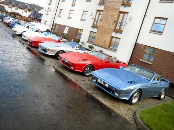 So it's out with the S, and down to meet up with the other two at the usual meeting place, after another fuel top-up. he weather isn't looking very promising so naturally we keep the roofs off for the drive through. As you do. I have no idea where we are meeting the rusty nailers - a Premier Inn in Dumbarton is as far as I got, so we're all following Dave. We have a nice run through Stirling, and then along the A811 to come in to the top end of Dumbarton. After a lap of the town, including a pass of Jackie Stewart's dad's garage and their old family house, we finally spot the Premier Inn with a row of TVRs outside, over to the right of the dual carriageway. A U-turn round the roundabout, and now the hotel and TVRs are on the left of the dual caarriageway, but there's no entrance. Another roundabout U-turn, followed by a right turn at the next one, and we're in the car park!