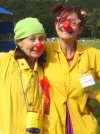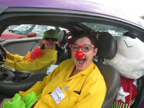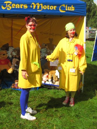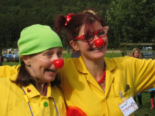 Despite the rain, we collect a fair bit of money. We are collecting today for the Clowndoctors, and two of the clowndoctors, Dr Squeegie and Dr Molotoff, have agreed to come and help us on the stand. They are absolutely brilliantly silly, and attract loads of people over to see what's going on. They also do a walkabout round the show to meet people and get them to come over.